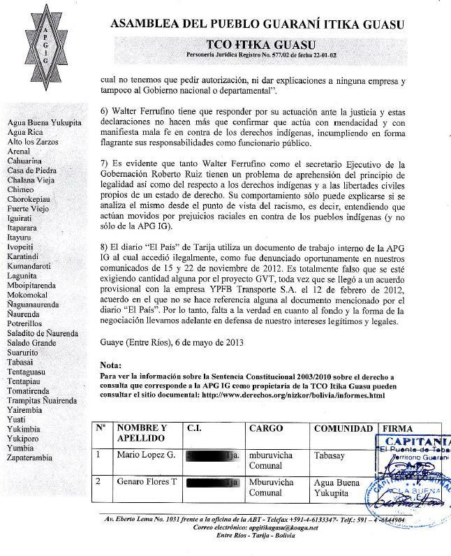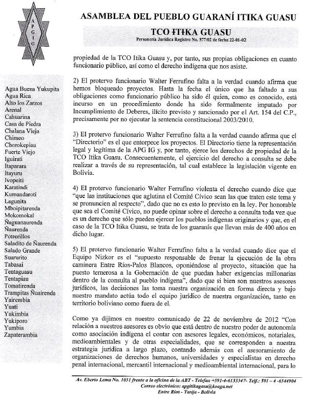 El secretario Ejecutivo de la Gobernación sabe perfectamente que la actual Gobernación ha incumplido sistemáticamente el Convenio que afecta a la variante del Chaco y ha procedido a la anulación ilegal de dicho proyecto, desconociendo la propiedad de la TCO Itika Guasu y, por tanto, sus propias obligaciones en cuanto funcionario público, así como el derecho indígena que nos asiste.
