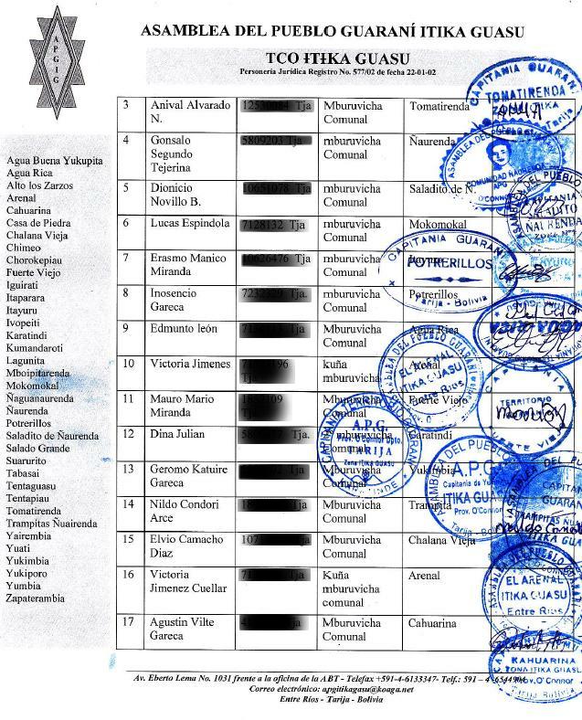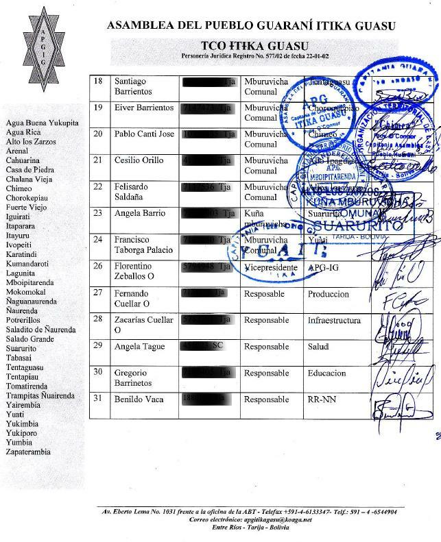 3) El protervo funcionario Walter Ferrufino falta a la verdad cuando afirma que el "Directorio" es el que entorpece los proyectos. El Directorio tiene la representación legal y legítima de la APG IG y, por tanto, ejerce los derechos de propiedad de la TCO Itika Guasu. Consecuentemente, el ejercicio del derecho a consulta se debe realizar a través de su representación, tal cual establece la legislación vigente en Bolivia.