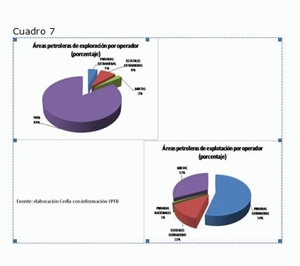 Lo interesante es ver qué pasa en la explotación. En esa fase de la cadena de los hidrocarburos, desaparece YPFB. Yacimientos no produce nada directamente, sólo produce en sociedad con Andina S.A. y Chaco S.A. en un área de explotación del 32% del total. Pero las privadas extranjeras y la estatal extranjera suman el 67%. Ellas tienen dos tercios y más de las áreas de explotación.