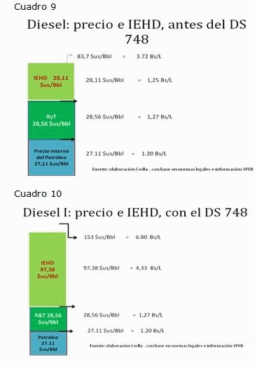 Veamos los cuadros precedentes. El cuadro 11 muestra la estructura de la estructura del precio del diesel antes del decreto 748. En el cuadro 12 se observa que lo que cambió con el DS 748 fue la alícuota del impuesto especial a hidrocarburos y derivados (IEHD), pues oficialmente no cambió el precio de referencia del petróleo como materia prima de las refinerías; sólo a partir de la aplicación del impuesto modificado aumentó el precio final al consumidor. Como se ve el precio saltó de Bs. 3,72 a Bs. 6,80. Entonces, antes del 748 este precio de 3.72 por litro estaba compuesto por 1,25 de impuesto, 1,27 de costos de refinería y transporte y un precio de referencia de 1,20 por litro de petróleo (al precio de 27 dólares el barril). Con el 748 cambia el IEDH y se mantienen todos los demás costos. El gran salto se produce en el IEDH. Pasa lo mismo en el caso de la gasolina.
