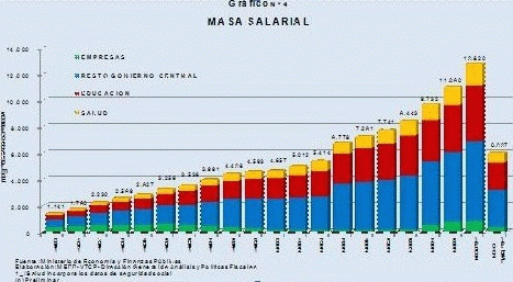 En el gasto corriente, la masa salarial en salud y educación ha ido creciendo, pero en proporción al crecimiento de la economía y la población (ver cuadro 5). Lo que se debe destacar es que con el MAS, se ha producido un importante incremento de la burocracia. Desde el 2007, aparece una franja del gasto corriente, que son las nuevas empresas públicas que gastan y no entregan nuevos ingresos al Estado. En el viejo estado nacionalista COMIBOL podía gastar porque producía, pero en el caso de las actuales empresas públicas en manos del estado, no hay datos de que haya alguna producción y utilidades importantes -excepto COMIBOL con la empresa minera Huanuni-, especialmente en los nuevos proyectos cómo EBA, Cartonbol, Papelbol, etc.