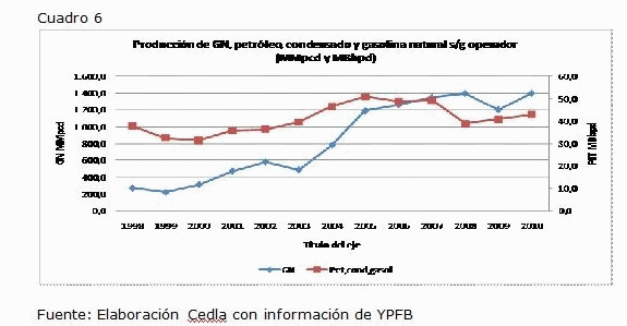 Hemos visto que hubo un crecimiento en las ventas de hidrocarburos. Sin embargo, la producción de petróleo, condensado y gasolinas se ha estancado (ver el cuadro 6). Subió del 2005 hasta el 2007 y desde el 2008 muestra una tendencia a la baja. La producción en gas natural también se ha estancado: la capacidad de producción es promedio 40 millones de metros cúbicos diarios. Alguna semana del año pasado la producción llegó a 45 millones de metros cúbicos y fue presentado por los voceros del gobierno como récord histórico.
