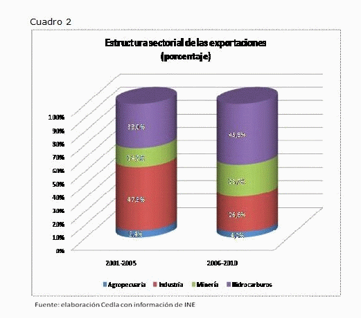En términos de exportaciones (cuadro 2), la presencia de la industria se ha reducido casi la mitad. No nos hemos convertido en país industrial como decía el discurso del MAS, es más, con este gobierno se reforzó la lógica de exportar más minerales e hidrocarburos para conseguir más recursos fiscales, descuidando los otros sectores productivos como la agricultura, y la industria. El gobierno aprovechó la dinámica externa de altos precios y no hizo nada más.