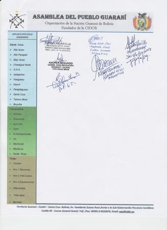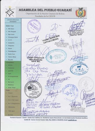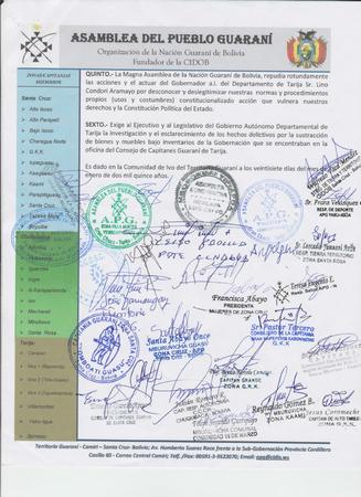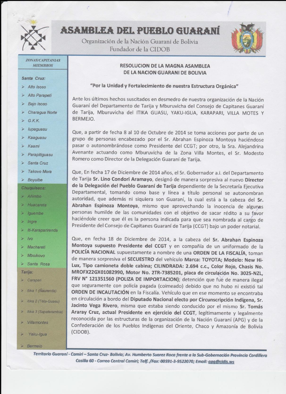"Por la Unidad y Fortalecimiento de nuestra Estructura Orgánica"Ante los últimos hechos suscitados en desmedro de nuestra organización de la Nación Guaraní del Departamento de Tarija y Mburuvicha del Consejo de Capitanes Guaraní de Tarija, Mburuvicha del ITIKA GUASU, YAKU-IGUA, KARAPARI, VILLA MOTES Y BERMEJO.
