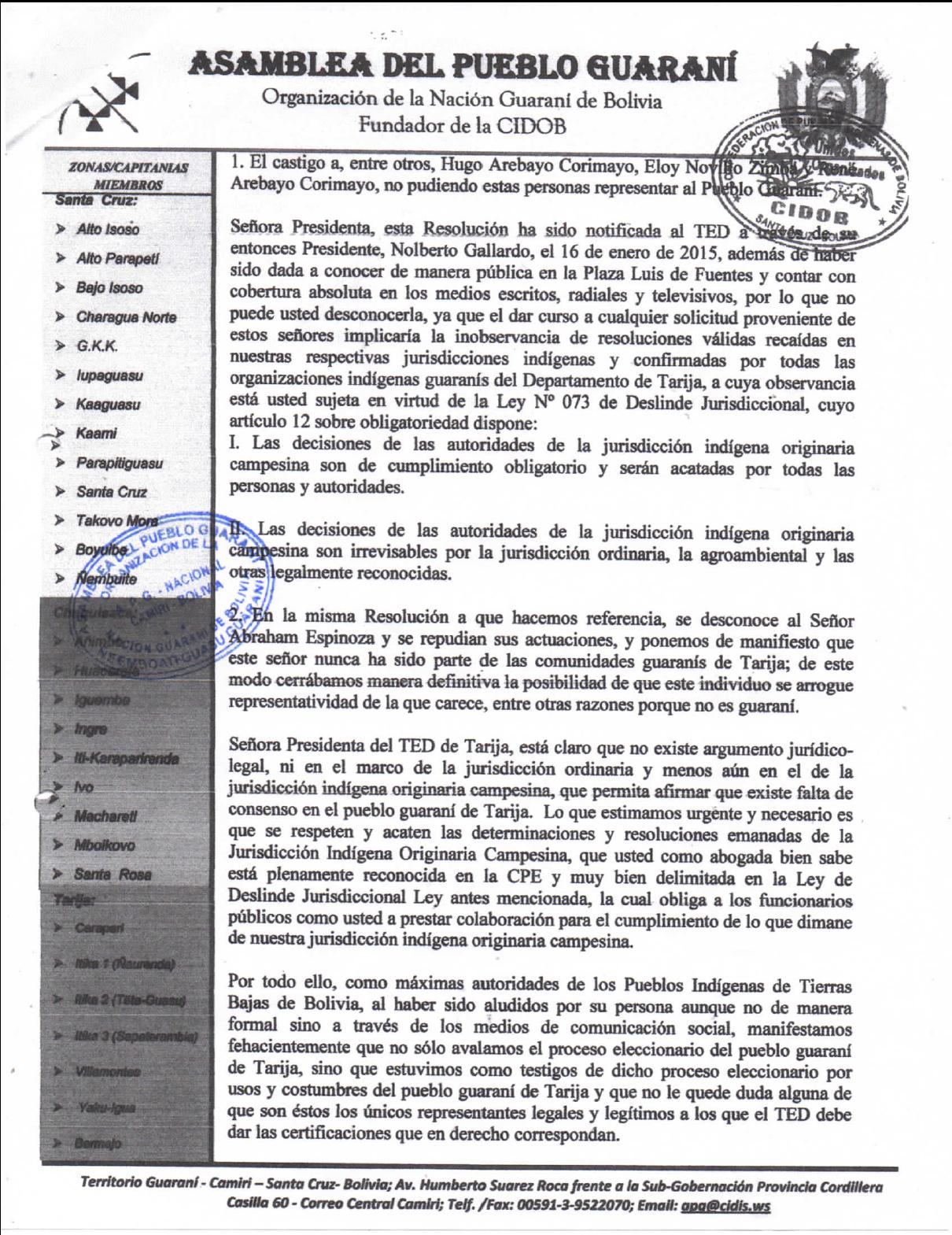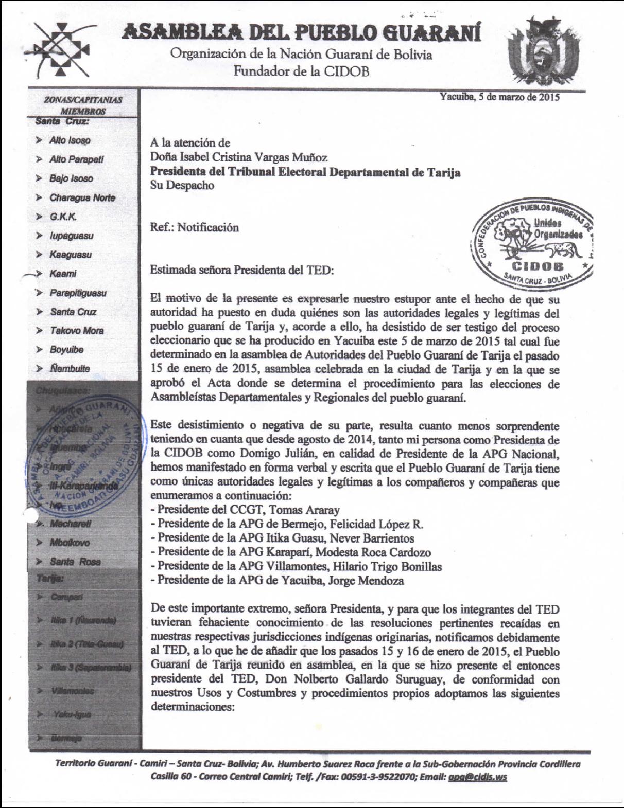 El motivo de la presente es expresarle nuestro estupor ante el hecho de que su autoridad ha puesto en duda quiénes son las autoridades legales y legítimas del pueblo guaraní de Tarija y, acorde a ello, ha desistido de ser testigo del proceso eleccionario que se ha producido en Yacuiba este 5 de marzo de 2015 tal cual fue determinado en la asamblea de Autoridades del Pueblo Guaraní de Tarija el pasado 15 de enero de 2015, asamblea celebrada en la ciudad de Tarija y en la que se aprobó el Acta donde se determina el procedimiento para las elecciones de Asambleístas Departamentales y Regionales del pueblo guaraní.