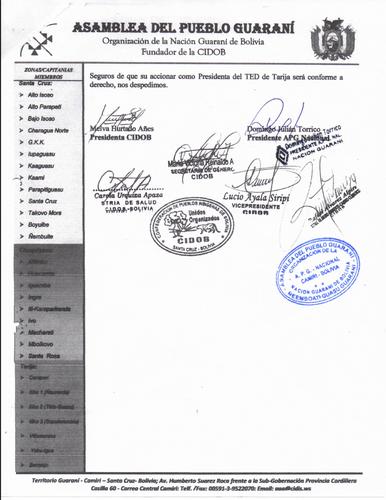 Por todo ello, como máximas autoridades de los Pueblos Indígenas de Tierras Bajas de Bolivia, al haber sido aludidos por su persona aunque no de manera formal sino a través de los medios de comunicación social, manifestamos fehacientemente que no sólo avalamos el proceso eleccionario del pueblo guaraní de Tarija, sino que estuvimos como testigos de dicho proceso eleccionario por usos y costumbres del pueblo guaraní de Tarija y que no le quede duda alguna de que son éstos los únicos representantes legales y legítimos a los que el TED debe dar las certificaciones que en derecho correspondan.