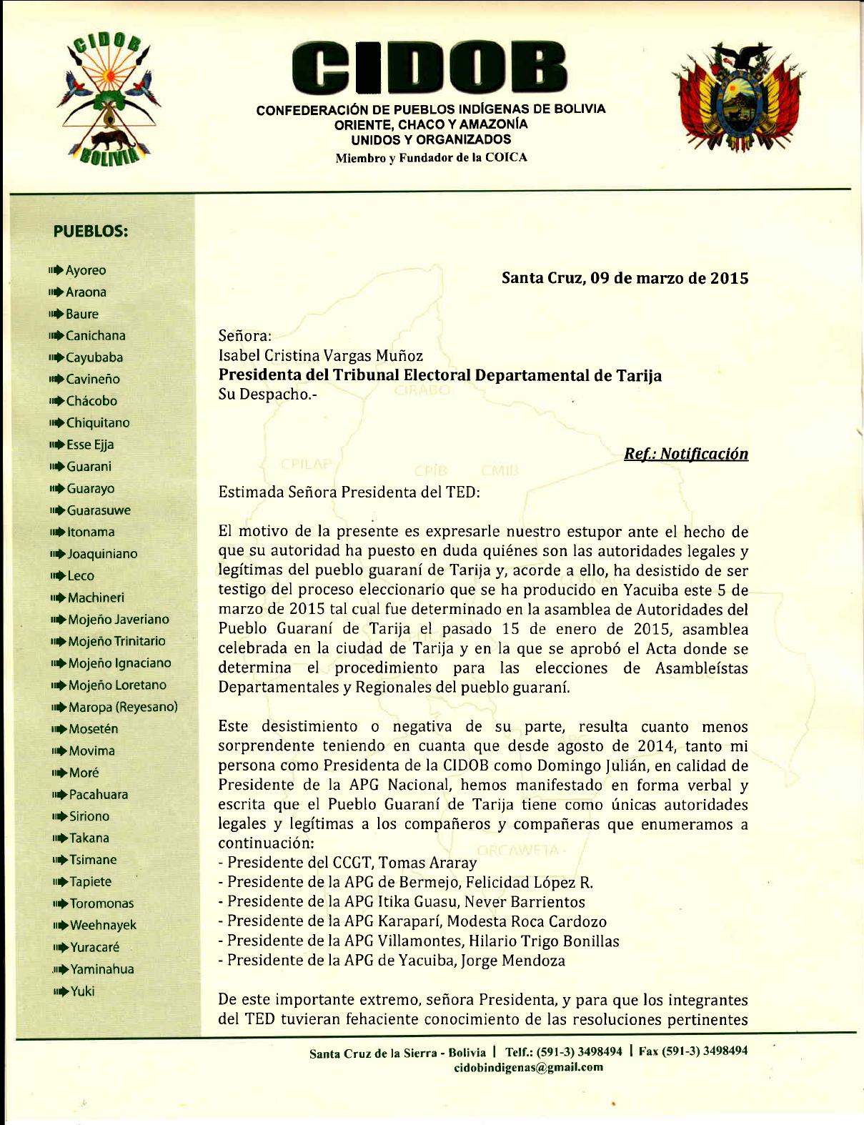 El motivo de la presente es expresarle nuestro estupor ante el hecho de que su autoridad ha puesto en duda quiénes son las autoridades legales y legítimas del pueblo guaraní de Tarija y, acorde a ello, ha desistido de ser testigo del proceso eleccionario que se ha producido en Yacuiba este 5 de marzo de 2015 tal cual fue determinado en la asamblea de Autoridades del Pueblo Guaraní de Tarija el pasado 15 de enero de 2015, asamblea celebrada en la ciudad de Tarija y en la que se aprobó el Acta donde se determina el procedimiento para las elecciones de Asambleístas Departamentales y Regionales del pueblo guaraní.