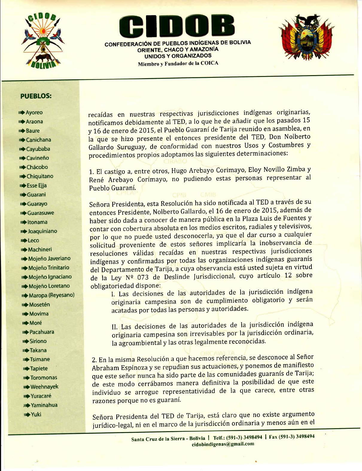 Señora Presidenta, esta Resolución ha sido notificada al TED a través de su entonces Presidente, Nolberto Gallardo, el 16 de enero de 2015, además de haber sido dada a conocer de manera pública en la Plaza Luis de Fuentes y contar con cobertura absoluta en los medios escritos, radiales y televisivos, por lo que no puede usted desconocerla, ya que el dar curso a cualquier solicitud proveniente de estos señores implicaría la inobservancia de resoluciones válidas recaídas en nuestras respectivas jurisdicciones indígenas y confirmadas por todas las organizaciones indígenas guaranís del Departamento de Tarija, a cuya observancia está usted sujeta en virtud de la Ley Nš 073 de Deslinde Jurisdiccional, cuyo artículo 12 sobre obligatoriedad dispone: