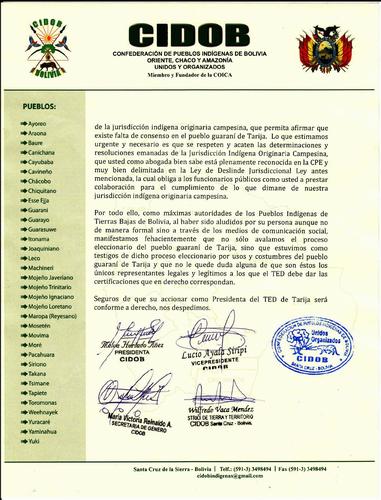 Por todo ello, como máximas autoridades de los Pueblos Indígenas de Tierras Bajas de Bolivia, al haber sido aludidos por su persona aunque no de manera formal sino a través de los medios de comunicación social, manifestamos fehacientemente que no sólo avalamos el proceso eleccionario del pueblo guaraní de Tarija, sino que estuvimos como testigos de dicho proceso eleccionario por usos y costumbres del pueblo guaraní de Tarija y que no le quede duda alguna de que son éstos los únicos representantes legales y legítimos a los que el TED debe dar las certificaciones que en derecho correspondan.