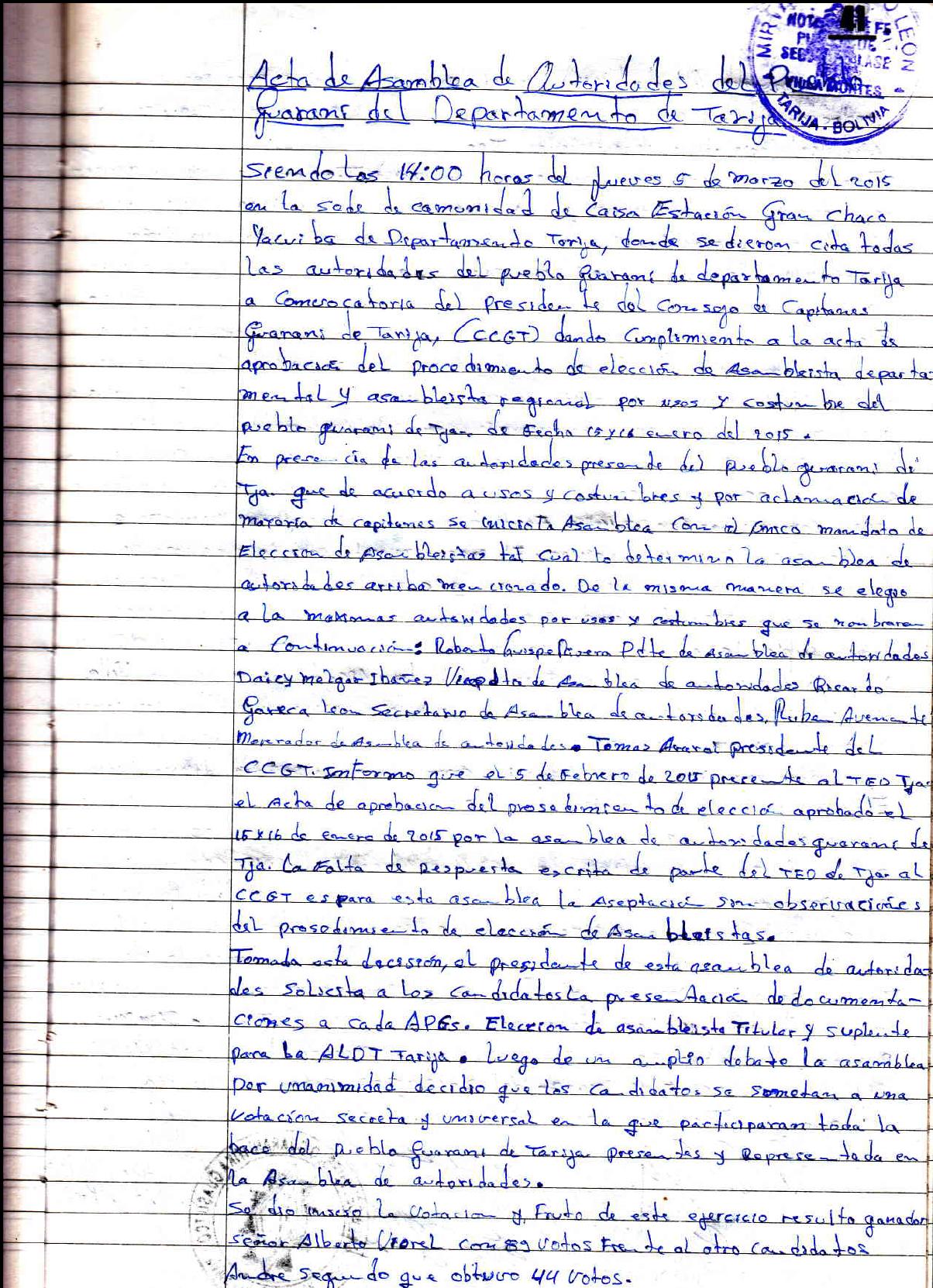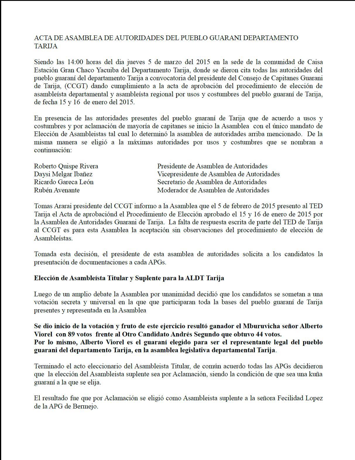 Roberto Quispe Rivera Presidente de Asamblea de Autoridades Daysi Melgar Ibañez Vicepresidente de Asamblea de Autoridades Ricardo Gareca León Secretario de Asamblea de Autoridades Rubén Avenante Moderador de Asamblea de Autoridades Tomas Ararai presidente del CCGT informo a la Asamblea que el 5 de febrero de 2015 presento al TED Tarija el Acta de aprobaciónd el Procedimiento de Elección aprobado el 15 y 16 de enero de 2015 por la Asamblea de Autoridades Guarani de Tarija. La falta de respuesta escrita de parte del TED de Tarija al CCGT es para esta Asamblea la aceptación sin observaciones del procedimiento de elección de Asambleístas.