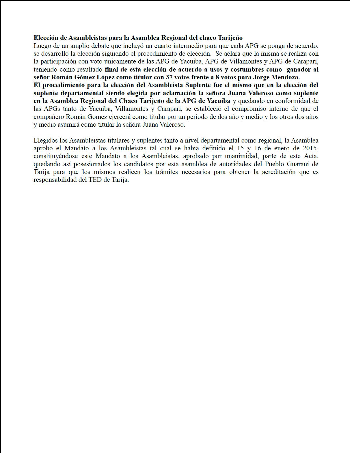 Elegidos los Asambleistas titulares y suplentes tanto a nivel departamental como regional, la Asamblea aprobó el Mandato a los Asambleistas tal cuál se había definido el 15 y 16 de enero de 2015, constituyéndose este Mandato a los Asambleistas, aprobado por unanimidad, parte de este Acta, quedando así posesionados los candidatos por esta asamblea de autoridades del Pueblo Guaraní de Tarija para que los mismos realicen los trámites necesarios para obtener la acreditación que es responsabilidad del TED de Tarija.