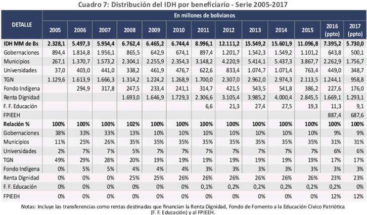 Según los datos de la Fundación, desde el 2005 el Estado recibió 15 mil millones de dólares por concepto del Impuesto Directo de los Hidrocarburos. De este monto, los mayores tres beneficiarios fueron los Gobiernos Municipales, la Renta Dignidad y el Tesoro General.