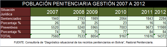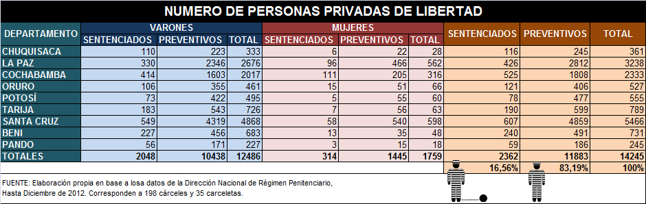Nš personas privadas de libertad Bolivia "es el número uno en toda Latinoamérica, después sigue Perú y los datos están comprobados en los cuadros estadísticos que estamos presentando, donde (se detalla) el número de detenidos preventivos en todo el país y por cada departamento", dijo.
