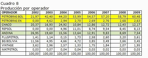 "En la fase de la producción de hidrocarburos, que es la decisiva, la participación de las empresas transnacionales como operadores es dominante: Petrobras Bolivia produce más del 60 y con su subsidiaria Petrobras Energía superan el 63%. Esta compañía era responsable en el 2004 del 46% de los hidrocarburos y ahora lo es por el 63%".
