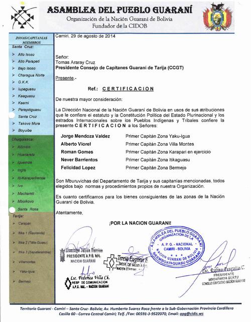 Carta de certificación de los Mburuvichas del Departamento de Tarija
