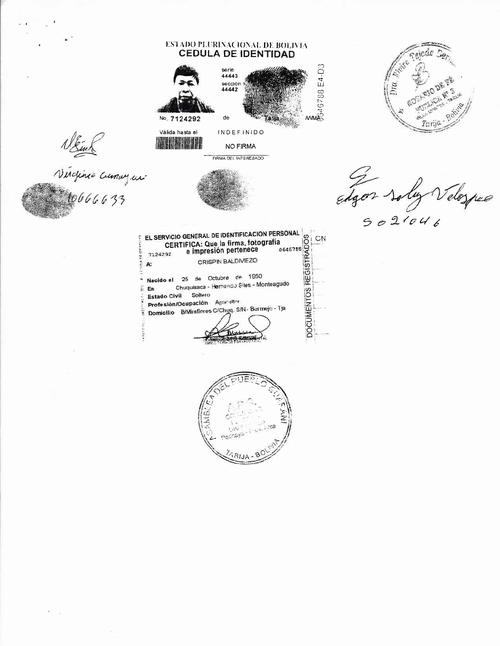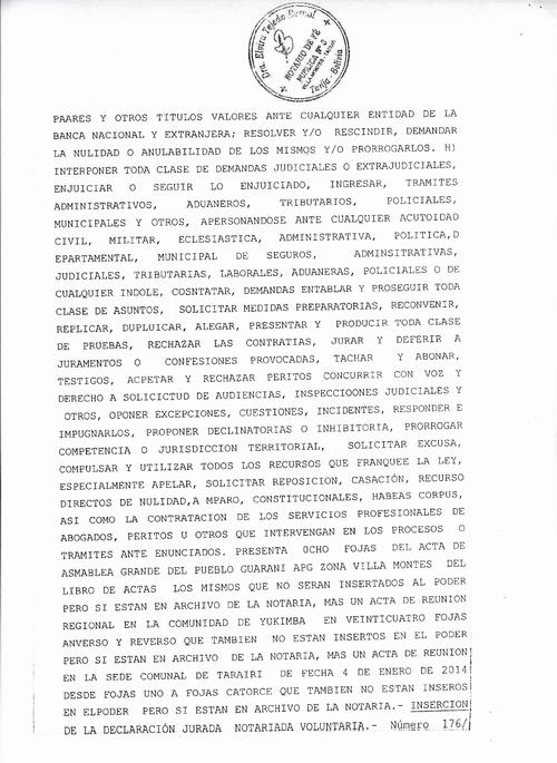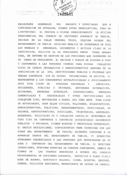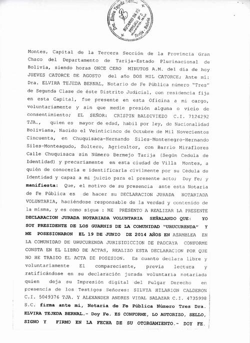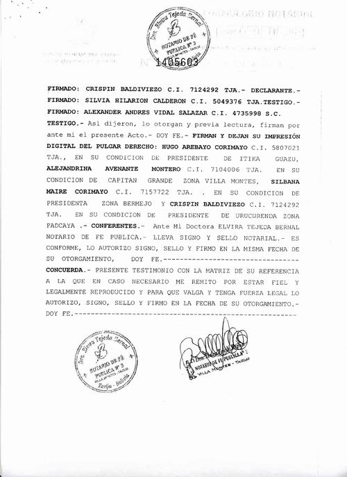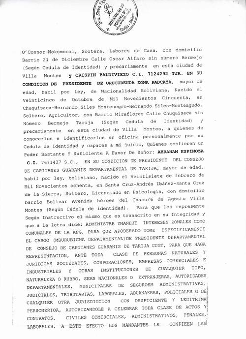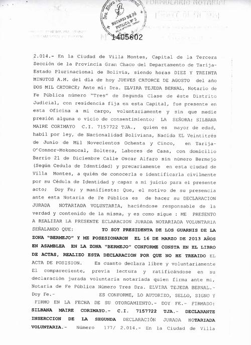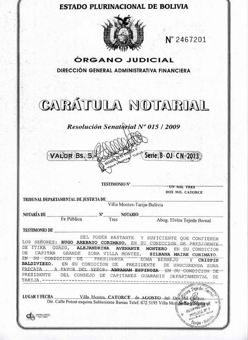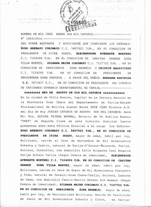 Walter FerrufinoMediante acta notarial expedida por la mencionada notaria el 14 de agosto de 2014, aparecen y se "legalizan" Hugo Arebayo Corimayo, "Presidente de Itika Guasu"; Alejandrina Avenante Montero en su condición de "Capitán Grande Zona Villamontes"; Silbana Maire Corimayo como "Presidenta de la Zona Bermejo" y Crispin Baldiviezo en su condición de "Presidente de Urucurenda Zona Padcaya", al tiempo que nombran a Abraham Espinoza como "Presidente del Consejo de Capitanes de Tarija".