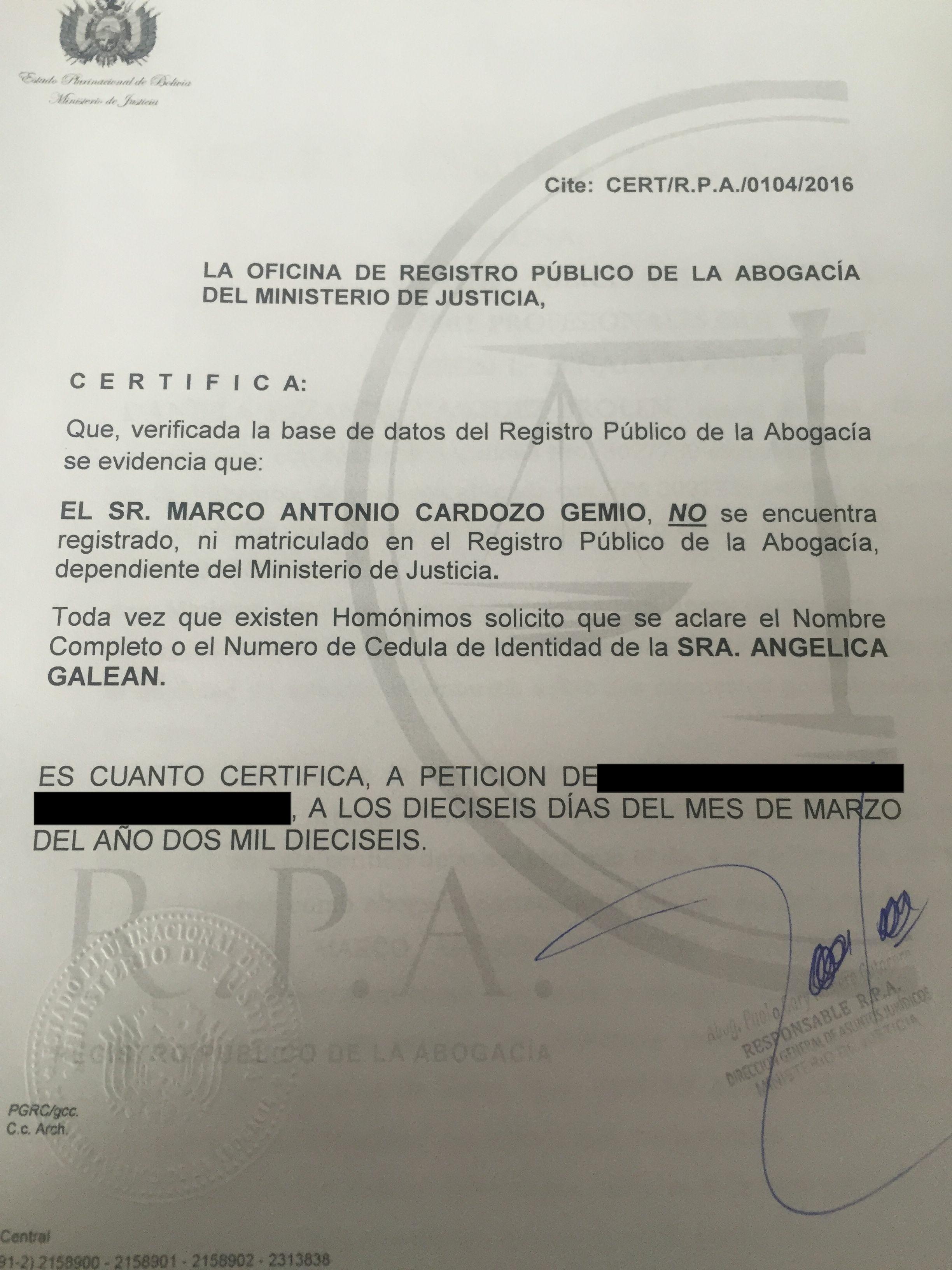 http://www.derechos.org/nizkor/bolivia/doc/tarija1438.htmlCertificado oficial que demuestra falsificación de título de Marco Antonio Cardozo Jemio