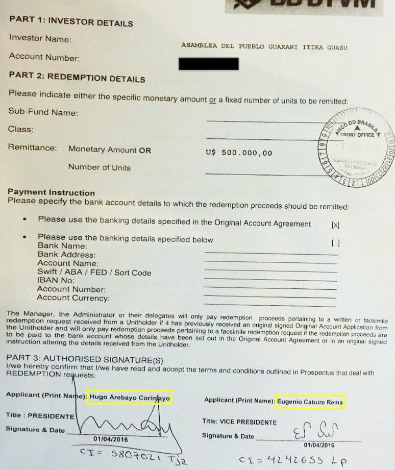 Haga click para ampliarloLa falsificación de actuaciones llegó al extremo de presentarse en Brasil para retirar la totalidad del dinero del Fondo de Inversión Itika Guasu y, como esto les resultó imposible, promovieron mediante la usurpación de firmas un documento para apropiarse de 500.000 dólares del mismo fondo. Estos son hechos probados documentalmente en jurisdicción penal fuera de Bolivia.