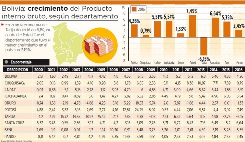 En 2016 la economía de Tarija decreció en 6,1%, en contraste el Producto Interno Bruto (PIB) de Potosí registró la tasa más alta del país con 7,49%, según datos del Instituto Nacional de Estadística (INE).