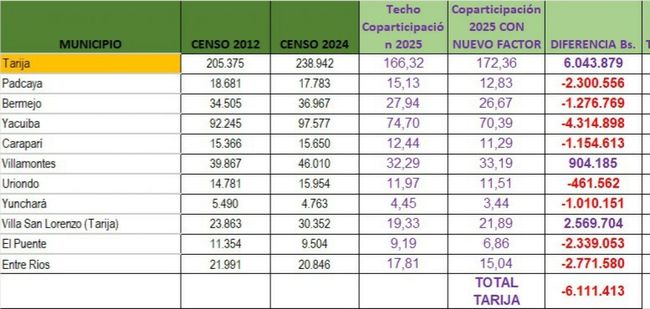 Romero explicó que esta situación obedece a que su crecimiento poblacional no ha sido significativo, y sobre todo, su peso poblacional es menor, además influenciado por el índice de desarrollo humano, índice de desarrollo económico y otros elementos que se utilizan para hacer los reajustes y mediante fórmula hacer la reasignación de recursos. Refirió que en el caso específico de Padcaya, ha decrecido en 4,8%; Yunchará en 3,2%; El Puente en 16,3% y Entre Ríos en 5,2%.
