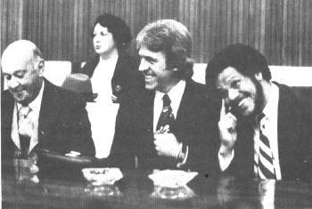 Os réus também riem. Da esquerda para a direita, o advogado Oswaldo de Lia Pires e seus clientes: Pedro Carlos Seelig e Orandir Portassi Lucas - Didi Pedalada - em 11 de junho de 1979, na 3ª Vara Criminal.