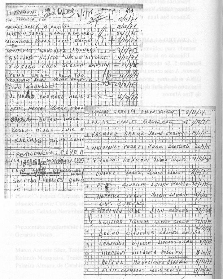 Fecha Hecho Nombre y Apellidos Edad Militancia Actividad 27/05/74 Reyes González Agustín Eduardo 23 MIR Artesano 04/06/74 Cubillos Calvez Carlos Luis 20 MIR Vendedor Ambulante 15/06/74 Ziede Gómez Eduardo Humberto 27 MIR Estudiante Sociología 17/06/74 Fioraso Chau Albano Agustín 23 MIR Profesor Castellano 18/06/74 Espinoza Méndez Jorge Enrique 24 MIR Estudiante Universitario 25/06/74 Villarroel Gangas Víctor Man 18 S/m Obrero 08/07/74 Acuña Castillo Miguel Ángel 18 MIR Estudiante 08/07/74 Garay Hermosilla Héctor Marci 18 MIR Estudiante 10/07/74 Toro Romero Enrique Segundo 28 PC Obrero 10/07/74 Uribe Tamblay Barbara Gabriela 20 MIR Secretaria 10/07/74 Van Yurick Altamirano Edwin 20 MIR Vendedor 13/07/74 Buzzio Lorca Jaime Mauricio 21 MIR Estudiante Técnico 13/07/74 Alvarado Borgel María Inés 21 MIR Secretaria 07/14/74 Contreras González Abundio al 28 MIR Trabajador Cora 15/07/74 Chacón Olivares Juan Rosendo 29 MIR Medico Veterinario 15/07/74 Elgüeta Pinto Martín 21 MIR Estudiante Economía 15/07/74 Lara Petrovich Eduardo Enrique 35 PC Empleado IRT 15/07/74 Moreno Fuenzalida Germán Rodol 25 MIR Estudiante Derecho 07/15/74 Villagra Astudillo José Caupol 40 PC Obrero 17/07/74 Quiñones Lembach Marcos Esteb 26 MIR Empleado Publico 18/07/74 Reyes Pina Daniel Abraham 24 MIR Peluquero 19/07/74 Poblete Cordova Pedro Enrique 27 MIR Obrero Metalúrgico 07/20/74 Guajardo Zamorano Luis Julio 22 MIR Estudiante Tec. Indu St. 07/20/74 Muñoz Andrade Leopoldo 22 MIR Egresado Esc.industrial 23/07/74 González Pérez Rodolfo Valen 19 S/m Servicio Militar Fach 25/07/74 Ibarra Toledo Juan Ernesto 21 MIR Estudiante Servicio Social 25/07/74 Nuñez Espinoza Ramón Osvaldo 20 MIR Estudiante 26/07/74 Chavez Lobos Ismael Darío 22 MIR Empleado Obras Publicas 27/07/74 Olivares Graindorge Jorge Alejandro 23 MIR Jardinero 07/29/74 Machuca Muñoz Zacarías Antonio 22 MIR Egresado Técnico Topog 30/07/74 Alarcon Jara Eduardo Enrique 49 MIR Albañil 30/07/74 Lazo Lazo Ofelio de la Cruz 43 PS MIR Carpintero 31/07/74 Chanfreau Oyarce Alfonso Rene 23 MIR Estudiante Filosofía 01/08/74 Montecinos Alfaro Sergio Sebas 28 PS Sastre e Interventor 05/08/74 Jorquera Encina Mauricio 19 MIR Estudiante 06/08/74 Andreoli Bravo María Angélica 27 MIR Secretaria 08/06/74 Dockendorff Navarrete Muriel 22 MIR Estudiante Economía 15/08/74 Espejo Gómez Rodolfo Alejandro 18 PS Estudiante Secundario 08/15/74 Gaete Farias Gregorio Antonio 24 PS Obrero y Em 15/08/74 González Inostroza Galo Hernán 27 MIR Empleado Particular 08/15/74 González Inostroza María Elena 22 MIR Profesora Dir.Escolar 16/08/74 Salcedo Morales Carlos Eladio 21 MIR Comerciante 17/08/74 Cabezas Quijada Antonio Sergio 29 PS Interventor 21/08/74 Arevalo Muñoz Víctor Daniel 26 PC Vendedor de Frutos 22/08/74 Arias Vega Alberto Vladimir 19 PC Mecánico en Radiadores 22/08/74 Tello Garido Teobaldo Antonio 25 MIR Fotógrafo Gab.Identificación 22/08/74 Espinoza Pozo Modesto Segundo 32 MIR Rondín 23/08/74 Aguilera Peñaloza Stalin Artu 41 PC Maestro Pintor 24/08/74 Maturana Pérez Juan Bautista 29 PC Comerciante 24/08/74 Olmos Guzman Gary Nelson 34 S/m Artesano del Calzado 26/08/74 Bravo Nuñez Francisco Javier 24 MIR Mecánico de Automoviles 27/08/74 Binfa Contreras Jacqueline 28 MIR Asistente Social 28/08/74 Barría Araneda Antonio Arturo 38 PC Profesor 29/08/74 López Díaz Violeta del Carmen 40 MIR Secretaria 05/09/74 Bustos Reyes Sonia de las Merc 30 PDC Cajera Servicio Invest 06/09/74 Chaer Vasquez Roberto 21 MIR Empleado Particular 06/09/74 Llanca Iturra Monica Chyslaine 23 MIR Empleada Gabinete 06/09/74 Morales Chaparro Edgardo Agust 38 PS Obrero 07/09/74 Aedo Carrasco Francisco Eduardo 63 PS MIR Profesor Arquitectura 07/09/74 Retamales Briceño Asrael Leona 44 S/m Mecánico Feria Libre 10/09/74 Pérez Vargas Carlos Freddy 25 MIR Publicista 13/09/74 Jara Castro José Hipólito 24 MIR Egresado Química y Far 14/09/74 De Castro López Bernardo 36 MIR Dibujante Publicista 14/09/74 Duran Rivas Luis Eduardo 29 MAPU MIR Estudiante Periodismo 14/09/74 Lagos Hidalgo Sergio Hernán 30 MAPU MIR Empleado Particular 14/09/74 Merino Molina Pedro Juan 20 PC Sastre 16/09/74 Carrasco Díaz Mario Edrulfo 18 S/m Estudiante Contabilidad 16/09/74 Palomino Benitez Vicente Segundo 30 MIR Profesor de Química 16/09/74 Zuñiga Tapia Héctor Cayetano 27 MIR Estudiante Quim. y Farm 17/09/74 Villalobos Díaz Manuel Jesús 22 MIR Vendedor 17/09/74 Gallardo Agüero Néstor Alfonso 24 MIR Contador 20/09/74 Gajardo Wolff Carlos Alfredo 34 MIR Arquitecto 20/09/74 Fuentes Riquelme Luis Fernando 23 MIR Estudiante Universitario 23/09/74 López Stewart María Cristina 22 MIR Estudiante Historia 25/09/74 Calderón Tapia Mario Eduardo 31 MIR Periodista 25/09/74 Salinas Argomedo Ariel Martín 26 MIR Estudiante Sociología 03/10/74 Andrónicos Antequera Jorge Eli 24 MIR Estudiante 04/10/74 Andrónicos Antequera Juan Carlos 23 MIR Estudiante 07/10/74 Miranda Lobos Eduardo Francis 27 MIR Topógrafo 24/10/74 Martínez Hernández Eugenia Del 25 MIR Obrera Textil 30/10/74 Droully Yurich Jacqueline Paul 24 MIR Asistente Social 10/31/74 D'orival Briceño Jorge Humberto 26 MIR Medico Veterinario 31/10/74 Salinas Eytel Marcelo Eduardo 31 MIR Técnico Radio y Tv 11/16/74 Reyes Navarrete Sergio Alfonso 26 MIR Egresado de Economía 17/11/74 Castro Salvadores Cecilia Ga 23 MIR Estudiante Derecho 19/11/74 Pizarro Meniconi Isidro Migue 21 MIR Técnico Maq.escribir 25/11/74 Arroyo Padilla Rubén David 29 MIR Artesano 26/11/74 Silva Peralta Claudio Guiller 23 MIR Estudiante Biología 27/11/74 Silva Camus Fernando Guillermo 61 MIR Decorador de Interior 27/11/74 De la Jara Goyeneche Félix 24 MIR Estudiante Pedagogía 29/11/74 Bueno Cifuentes Carmen Cecilia 24 MIR Cineasta 07/12/74 Palominos Rojas Luis Jaime 23 MIR Estudiante 08/12/74 Cid Urrutia Washington 25 MIR Estudiante Pedagogía 09/12/74 Bustillos Cereceda María Teres 25 MIR Estudiante Servicio Social 09/12/74 Peña Solari Mario Fernando 21 MIR E