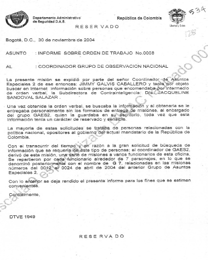 El memorando, fechado 30 de noviembre de 2004, corresponde a un informe sobre la "orden de trabajo 008", emitida por el entonces coordinador del Grupo de Asuntos Especiales 2 (GAES 2), Jimmy Galvis Caballero, actual funcionario de la Fiscalía hasta hace poco asignado como investigador contra las llamadas "bandas criminales" (BACRIM), grupos sucesores del paramilitarismo que funcionan al amparo del narcotráfico. Galvis y otros 11 detectives responden en juicio por las llamadas "chuzadas" del DAS pero no se encuentra detenido.