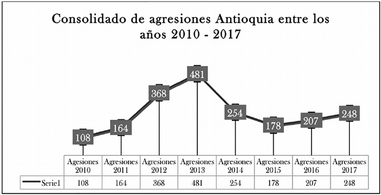 Se registran un total de 2008 agresiones entre el 1 enero de 2010 y el 30 de octubre de 2017, ello indica que cada día se presentan 0,7 agresiones contra las y los defensores de derechos humanos tan solo en el Departamento de Antioquia, esto indica que por lo menos en Antioquia, todos los días hay un defensor agredido.