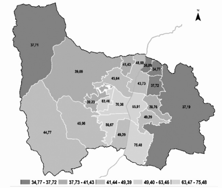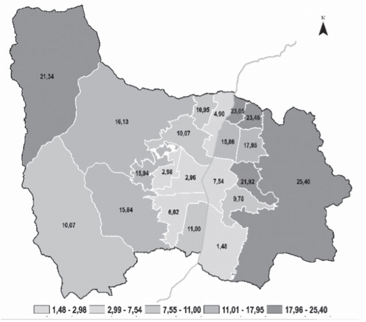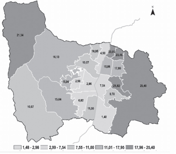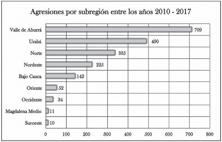 En la Figura 2, se resumen las agresiones que se han concentrado en las diferentes subregiones con los porcentajes indicados de la siguiente manera: el 35,5% para el Valle de Aburrá, el 24,4% ocurrieron en la Subregión de Urabá, el 16,7% en el Norte de Antioquia, el 11,2% en el Nordeste, el 7% en el Bajo Cauca y, en más pequeña proporción en las demás subregiones.