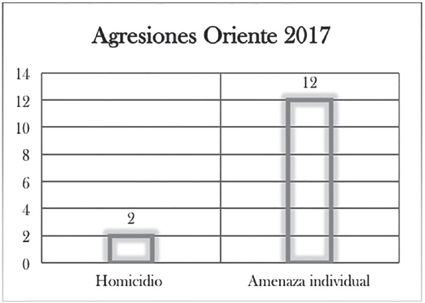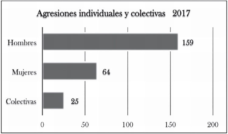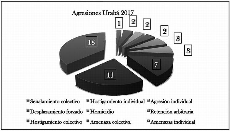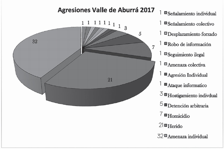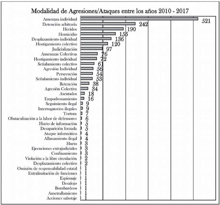 El porcentaje de las modalidades de agresiones corresponden a 26% amenazas individuales, 12% detenciones arbitrarias, 9,5% heridos, los 155 homicidios ocurridos entre el 2010 y el 10 de noviembre del 2017 equivalen al 8% de las agresiones, de igual manera 6,7% a desplazamiento, principalmente.