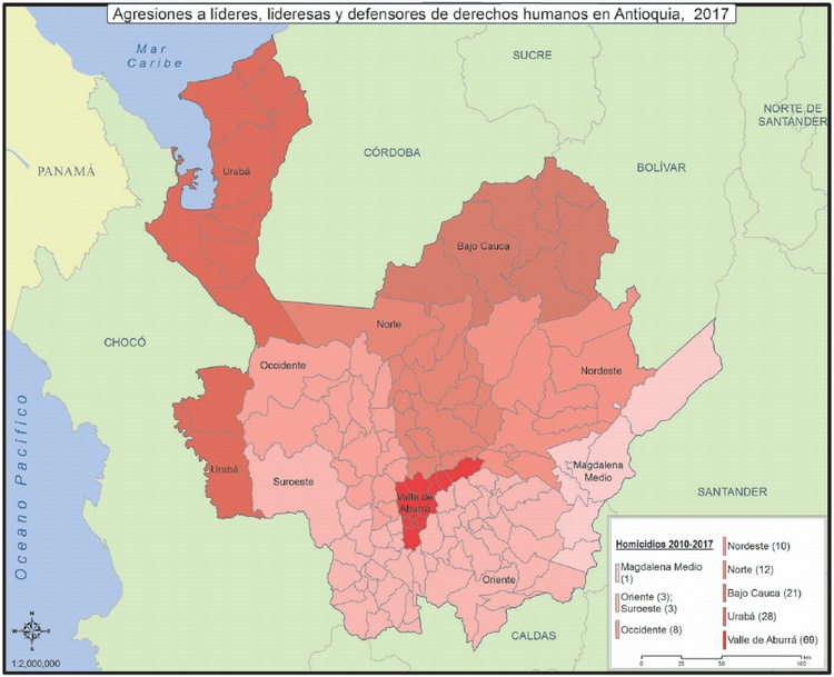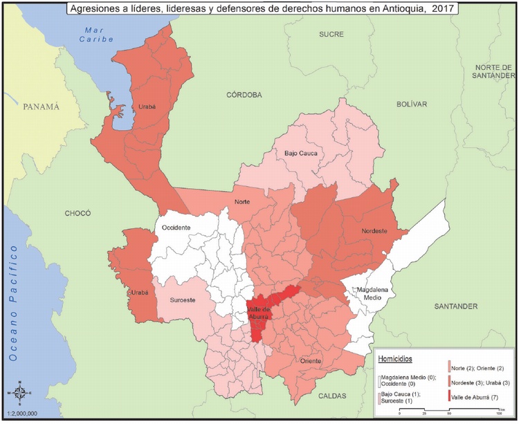 La situación de vulnerabilidad y agresiones de líderes y defensores de derechos humanos en Colombia ha ahondado y en Antioquia es, en este momento, muy crítica. Los hechos de violencia presentan unos altos grados de sistematicidad e impunidad negada por el Estado, lo que agrava la situación. Al analizar los motivos de hechos y situaciones, todo parece indicar, estarían dirigidas en limitar la participación de líderes sociales en política, entorpecer procesos de construcción de verdad, sustitución de cultivos, restitución de tierras o asuntos nodales de lo firmado en el acuerdo de La Habana.