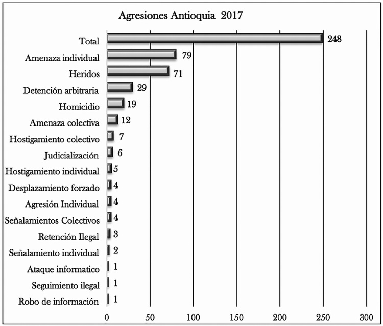 De 248 agresiones Figura 7, podemos determinar que cada día ocurren 0,8 agresiones contra un líder en Antioquia, es decir, por lo menos una agresión por día. El 31,85% amenazas, 28,6% heridos, 11,7% fueron detenciones arbitrarias, y el 8% homicidios. El aumento de las agresiones está relacionado con las manifestaciones y exigencia de derechos durante las mismas en el año 2017 en el barrio Nueva Jerusalén (Bello), y en Remedios y Segovia, tan solo la cifra de agresiones cometidas por el Esmad asciende a 95%.