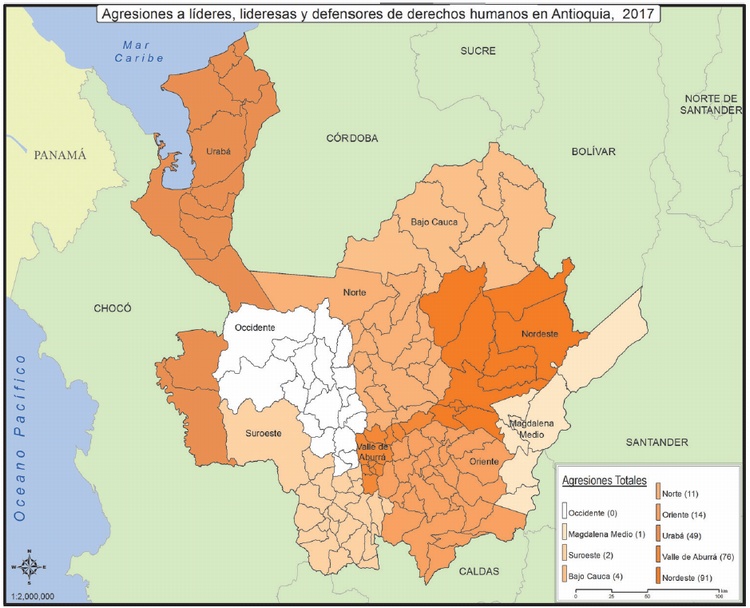 El Norte, Nordeste, Bajo Cauca y Urabá son las zonas más sensibles en el tema de paz, pero también son zonas donde hay una fuerte presencia de organizaciones sociales y defensores de derechos humanos que ejercen de manera responsable la labor, siendo el Nordeste y Urabá los sitios donde se concentran la mayor intensidad de agresiones.