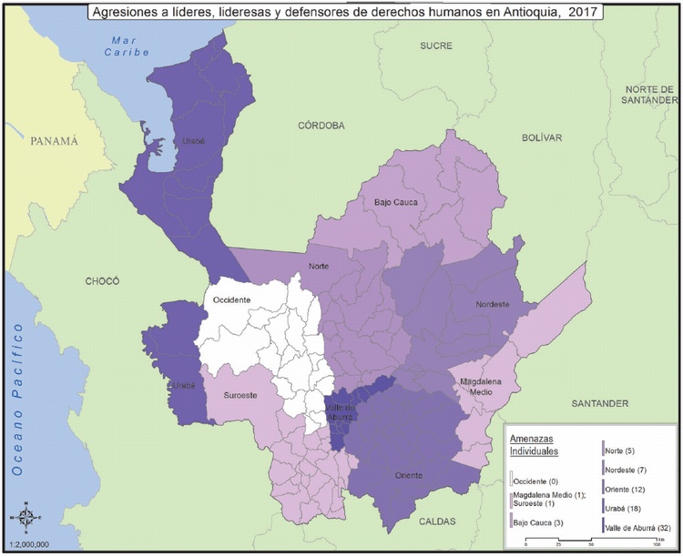Estas amenazas suceden en centros de poder que, además están estrechamente relacionados con las circunscripciones especiales de paz como la subregión de Urabá, Bajo Cauca, Norte de Antioquia y se presentan en mayores proporciones en el Valle de Aburrá. Para este informe 2017 hemos registrado un incremento preocupante para el Oriente antioqueño.