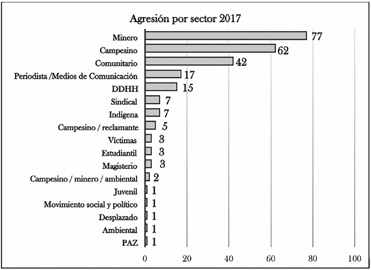 El 24% de estas agresiones ocurrieron en el 2013, gran parte en el marco del Paro Nacional Agrario, el 18,3% sucedieron durante el año 2012, el 13% en el 2014, el 10% en el 2016 y 12,3% en el 2017. Entre el 2016 y 2017 las cifras experimentan un aumento en proporción del 20%. Durante el mes de junio 2016 se llevó acabo La Minga Nacional Agraria Campesina, Étnica y Popular, donde se realizó una movilización por la reivindicación de derechos de las comunidades ante el incumplimiento del Gobierno Nacional a lo pactado en los paros nacionales de 2013 y 2014. La crisis estructural de las condiciones sociales y económicas del campo se profundiza estrepitosamente por la falta de una legislación agraria acorde a las necesidades del país y de la población campesina.