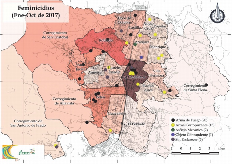 Si bien en el año 2016 disminuyeron los asesinatos de las mujeres en Medellín con respecto al año 2015, pasando 46 casos a 37 casos respectivamente, en el año 2017 se incrementaron un 53% con 51 |31| casos, analizados estos tres años se observa que la mayoría de mujeres asesinadas son jóvenes, con edades comprendidas entre los 18 y 30 años de edad y el lugar de la ciudad con mayor índice es la comuna 10, la Candelaria. Igual que en el consolidado general la mayoría de los homicidios son por arma de fuego seguida por el arma cortopunzante. Frente a ello las organizaciones de mujeres de la ciudad plantean dos asuntos cardinales: uno, a los hombres los matan por razones distintas, como por el conflicto urbano o problemas de combos, mientras que a las mujeres por su condición de género; dos, existe poca información oficial sobre los agresores que cometieron los homicidios contra las mujeres y los feminicidios, lo cual queda reflejado en los pocos avances alcanzados en materia de investigación de estos delitos, y en la alta impunidad reinante, como consecuencia de "las barreras para el acceso a la atención, desde la institucionalidad, (...), falta de recursos y de personal idóneo para la gran cantidad de casos que deben resolverse, poca divulgación de la ley que protege a las mujeres, lentitud en los trámites de denuncia: recolección de pruebas, medidas de protección y judicialización, lo que aumenta el riesgo de las víctimas |32|.