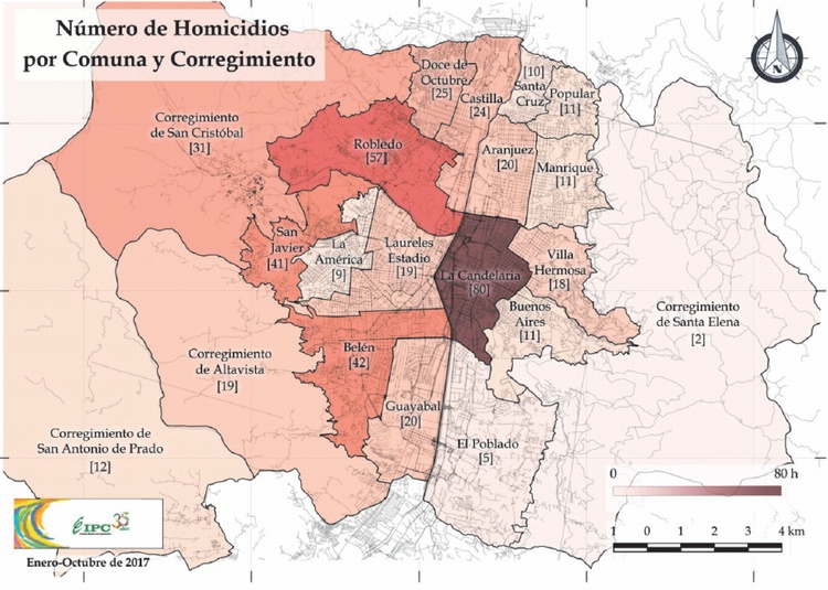 De tal magnitud es la naturalización, el control del crimen organizado y el miedo construido en los territorios, que en el 2017 solo se registraron entre enero y octubre 280 denuncias por extorsión, una disminución con respecto a las 291 denuncias registradas en el año 2016. Las comunas con mayor nivel de denuncias en lo recorrido del año están ubicadas en la ladera occidental de la ciudad la Comuna 16 Belén con 31 denuncias; Laureles-Estadio, con 23; y La Candelaria con 42 denuncias registradas, y en el lado oriental de la ciudad la comuna Popular registra 3 casos y Santa Cruz 6. El corregimiento de San Cristóbal ubicado en la zona occidental presenta 19 denuncias.