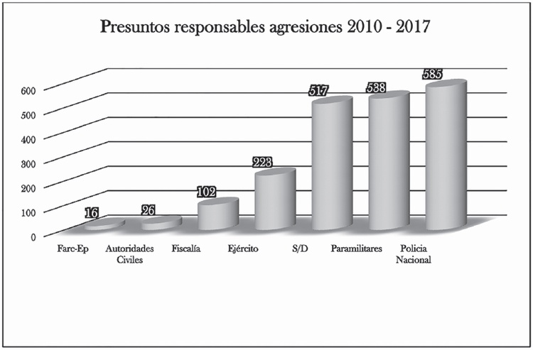 De los presuntos responsables agrupados en la Figura 6 encontramos que la policía ha cometido el 29%, en gran medida estas agresiones suceden en el marco de la movilización y protesta social -derecho constitucional que ha sido reprimido por el Estado en diversos momentos de la historia- esa responsabilidad recae principalmente sobre el llamado Escuadrón Móvil Antidisturbios. El 26,8% de los ataques son cometidos por los grupos para-militares, en el 25,7% de los casos no se ha podido identificar al agresor -una de las características donde ocurren estas agresiones es que suceden en sitios estratégicos donde es evidente la fuerte presencia de grupos para-militares-, el 11% fueron presumiblemente cometidas por el Ejército Nacional, se podría indicar entonces que la Fuerza Pública comete el 40% de las agresiones contra defensoras y defensores, la Fiscalía el 5,1%, Autoridades Civiles el 1,3% y las FARC-EP el 0,8%.