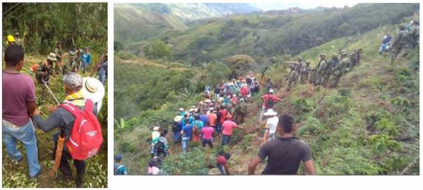 Corregimiento El Carmelo, Cacahual; Altamira y El Dorado, aproximadamente a las 8:30 de la mañana, alrededor de 300 hombres miembros de la Fiscalía, Ejército y la Policía Nacional, continúan el procedimiento de erradicación forzada Lanzaron gases lacrimógenos, amenazando con contarlos con las guadañas a habitantes y disparando indiscriminadamente armas de fuego, además dispararon gases lacrimógenos a 35 niños del colegio de la verada el Dorado (Escuela Rural Mixta El Dorado), generando afectaciones a los menores en especial, a una niña de 8 años de edad, adicional la fuerza Pública disparo contra la comunidad en general a menos de 200 metros de distancia.