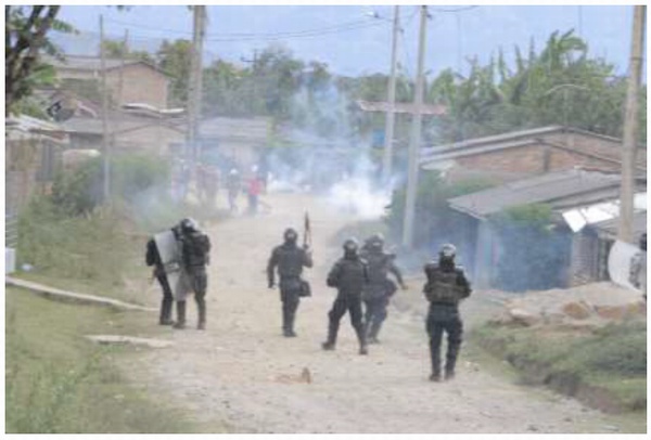No permitiéndoles el paso en la zona que comunica a las veredas de Ortega y el Carmelo, lazando gases dentro de las casas que se encontraban habitadas.