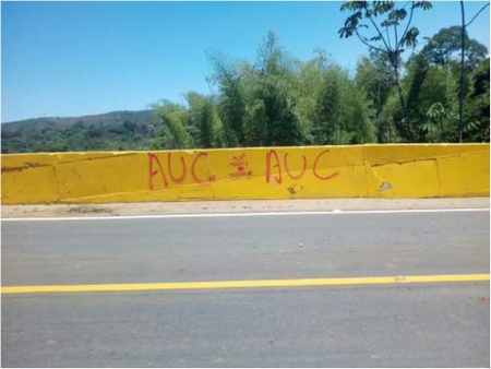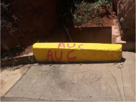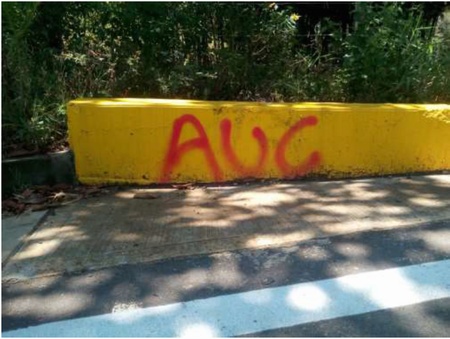 Sector conocido como Casas Viejas, los habitantes que transitan por el lugar encuentran en los muros de contención tres (3) grafitis, con las siglas AUC, del grupo paramilitar autodenominado "Autodefensas Unidas de Colombia"