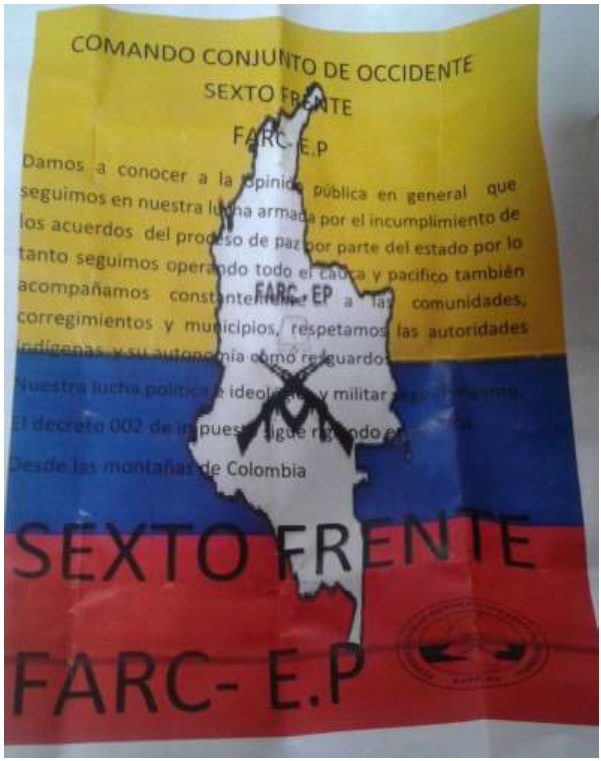 Corregimiento Huasano, en horas de la mañana cuando los habitantes del casco urbano se disponían a iniciar sus labores diarias encuentran panfletos por las vías del corregimiento con el siguiente contenido;