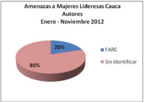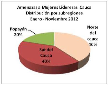 Las amenazas en contra de las lideresas y defensoras de Derechos humanos sigue siendo parte de la estrategia de intimidación empleada por los actores del conflicto en el 2012. Disminuyeron las amenazas colectivas hacia las mujeres con respecto al 2011 y se registraron 5 amenazas individuales a mujeres lideresas en este periodo. El 80% provienes de actores sin identificar y el 20% de las FARC. El Norte (Santander de Quilichao y Toribío) y el Sur del Cauca (Rosas y San Sebastián) son los territorios en donde se presentaron las amenazas a las mujeres con algún tipo de quehacer político y/o comunitario. En el Norte del Departamento las víctimas de las amenazas fueron lideresas indígenas y en el Sur del departamento fueron lideresas vinculadas a procesos campesinos y comunitarios.