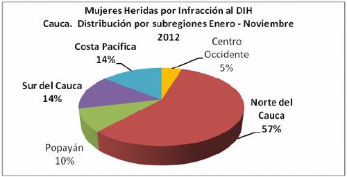 El Observatorio de la Red por la Vida registra 21 mujeres heridas por infracciones al DIH en el marco del conflicto armado. Esta cifra reporta un incremento de 16,5% con respecto al 2011, lo que da cuenta del escalamiento y el recrudecimiento de los combates y las acciones contra la población civil ejercidas por los actores armados legales e ilegales. El Norte del cauca es el territorio con mayor número de mujeres heridas (57%), especialmente en los municipios de Miranda, Caldono y Toribío. La Costa Pacífica que no registraba datos en el 2011, aparece con el 14% de las mujeres en esta situación, develando de esta manera los mayores niveles de confrontación armada que se han dado en esta zona del departamento. En el Sur del Cauca, el municipio de Argelia reporta el mayor número de casos.