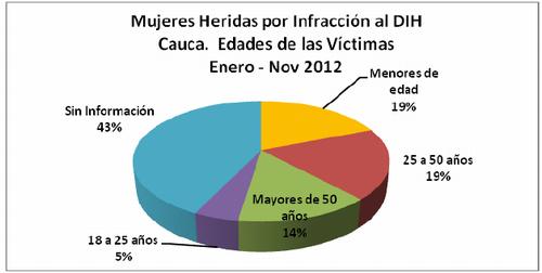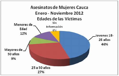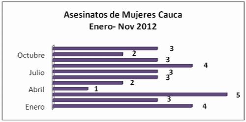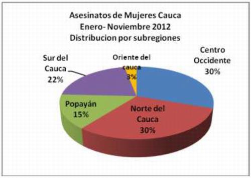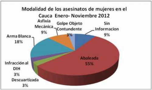 Asesinatos de mujeres en el Cauca: En lo que va corrido del año (Enero-Noviembre) del 2012 han sido asesinadas 33 mujeres en el departamento del Cauca, 10% más que durante el año 2011. La modalidad más empleada para el asesinato de las mujeres fue la utilización de armas de armas de fuego (55%), seguido del empleo de armas blancas (18%). Esta tendencia, registrada también durante el 2011 pero en menor proporción, es una muestra de la degradación en las formas de asesinatos a las mujeres caucanas, pues evidencia la verdadera intencionalidad de matar por parte de los agresores.