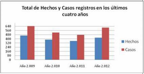 La gráfica que a continuación se presenta, da cuenta del comportamiento de la violencia en el departamento en los últimos cuatro años de cuerdo con los datos registrados en el Observatorio de DDHH y DIH de la RED, cabe resaltar aquí que la información y los datos sistematizados son recolectados de fuentes primarias (víctimas y/o familiares de las victimas - organizaciones sociales), fuentes secundarias como medios de comunicación (radio, prensa y televisión) y fuentes institucionales (Defensoría del Pueblo, Sistema de Alertas tempranas, Personerías Municipales), y que ésta no significa necesariamente la totalidad de hechos presentados, pues se reconoce un sub- registro de la misma, sin embargo da cuenta de las realidades que se viven en la región convirtiéndose así en herramienta de análisis y seguimiento.