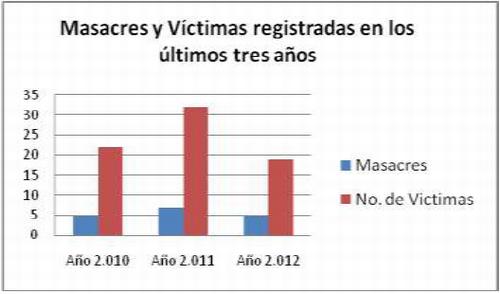 Según la Oficinade la Alta Comisionada de las Naciones Unidas para los Derechos Humanos en Colombia, constituye una masacre, la ejecución de tres o más personas en un mismo evento o eventos relacionados por la autoría, el lugar y el tiempo |1|, en el departamento del Cauca se viene realizando esta práctica como una forma de generar terror en las comunidades. En el periodo 2.010 - 2.012 se han registrado un total de 17 masacres que han dejado 73 víctimas. En lo corrido del 2012 se registraron 5 masacres que dejaron 9 víctimas.