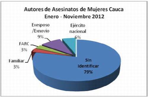 En el 79% de los homicidios, los autores de los homicidios son desconocidos, esta situación devela nuevamente la inoperancia de la justicia a la hora de investigar y sancionar los crímenes cometidos hacia las mujeres y eleva la impunidad en la que se mantiene este tipo de violencia. Aumentó en dos puntos con respecto al 2011 los autores sin identificar, así como los feminicidios ejecutados por exnovios y exesposos (9%). Se presentaron dos casos de ejecuciones extrajudiciales en el departamento y un caso identificado por parte de las FARC. Insistimos en la necesidad de avanzar en una decisión política clara de la justicia para avanzar en la judicialización de los responsables, así como una política pública de seguridad del Estado que proteja efectivamente a las mujeres, especialmente en aquellos territorios de alta incidencia del Conflicto armado