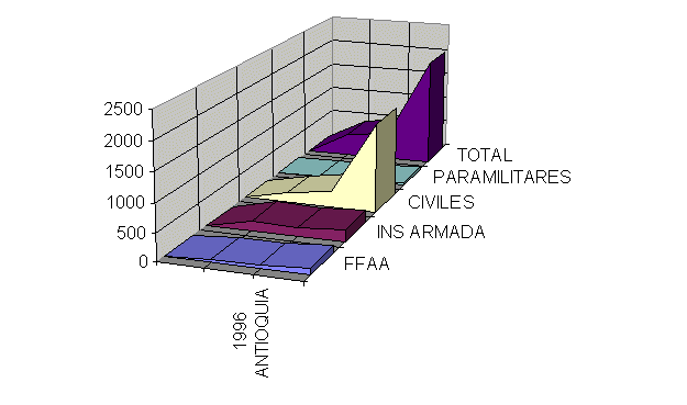 Antioquía para 1996 de 1 de Enero a 31 de Diciembre, registra 394 acciones, sus actores más resultantes fueron los paramilitares y la insurgencia, combinando nuevos métodos de logística militar. A estos se suman las fuerzas militares por ser la fuerza regular que contiene la beligerancia de las fuerzas irregulares insurgentes. Pero ahora contamos con un significante actor en las zonas Antioqueñas de Urabá, Norte, Bajo Cauca, Occidente, Oriente, y el Area Metropolitana, las Autodefensas Campesinas de Córdoba y Urabá ACCU.