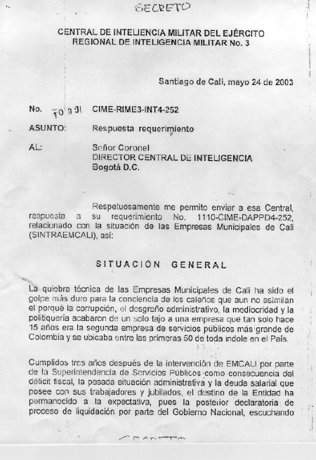 Este documento es copia del escrito que había sido remitido, el 24 de mayo de 2003, desde Santiago de Cali, por la Central de Inteligencia Militar del Ejército, Regional de Inteligencia Militar Nº 3, al Señor Coronel, Director Central de Inteligencia, en Bogotá. El documento fue numerado internamente bajo la referencia: 093 CIME-RIME3-INT4-252 y fue encontrado por Fiscalía y el Cuerpo Técnico de Investigaciones CTI, en dos allanamientos, en la ciudad de Cali y Medellín el 25 de agosto de 2004, a causa de la denuncia presentada por el Representante Alexánder López Maya; el mismo se encuentra en los archivos del Equipo Nizkor. [Para más información ver el documento Descubierta la "Operación Dragón" para asesinar congresistas, defensores de Derechos Humanos y líderes sindicales.]